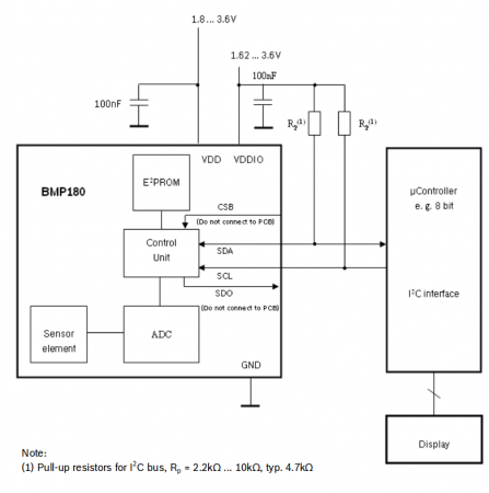 El módulo utilizado incluye además del sensor un regulador de voltaje (5V a 3.3V), resistencias pull-up y capacitores by-pass. El Modulo puede alimentarse directamente de una fuente de 5 voltios. La siguiente figura muestra las conexión básica electronilab.co/tienda/sensor-de-presion-barometrica-bmp180/